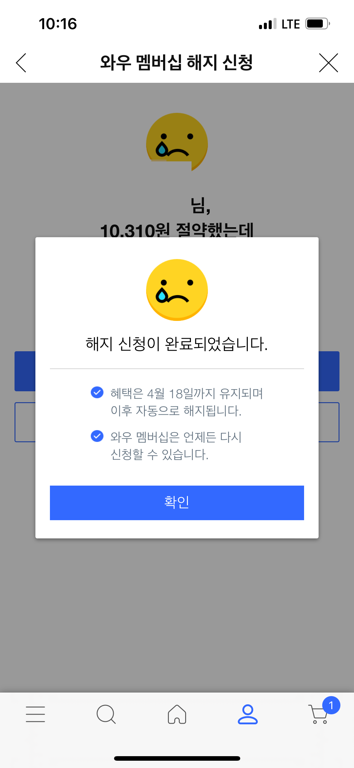 드디어 해지를 완료했습니다. 해지를 했어도, 기존 이용하던 로켓와우 멤버십 기간 동안에는 혜택을 이용할 수 있으니, 그 전까지 활용할 수 있는 만큼 활용하시면 됩니다.
