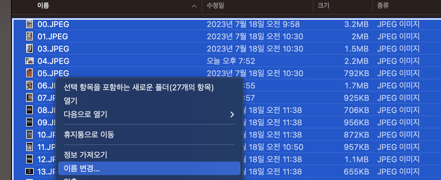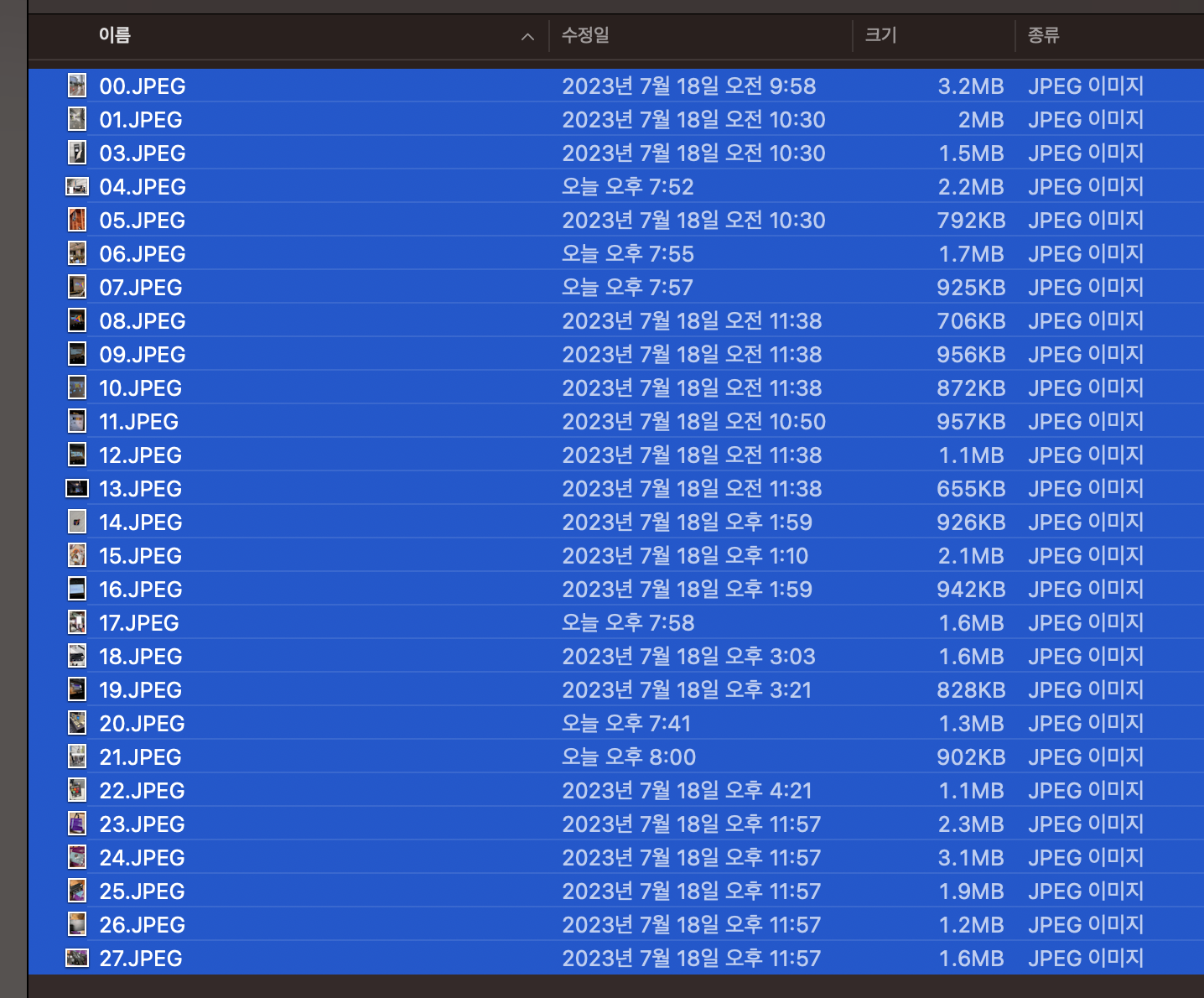 먼저, macOS의 Finder를 통해서 일괄 수정하려는 폴더 내부를 진입해줍니다. 위와 같이 많은 파일들이 .JPEG 확장자를 갖고 있는 상태입니다. 여기에서 폴더의 일부 이름을 일괄로 수정해보려고 해요.