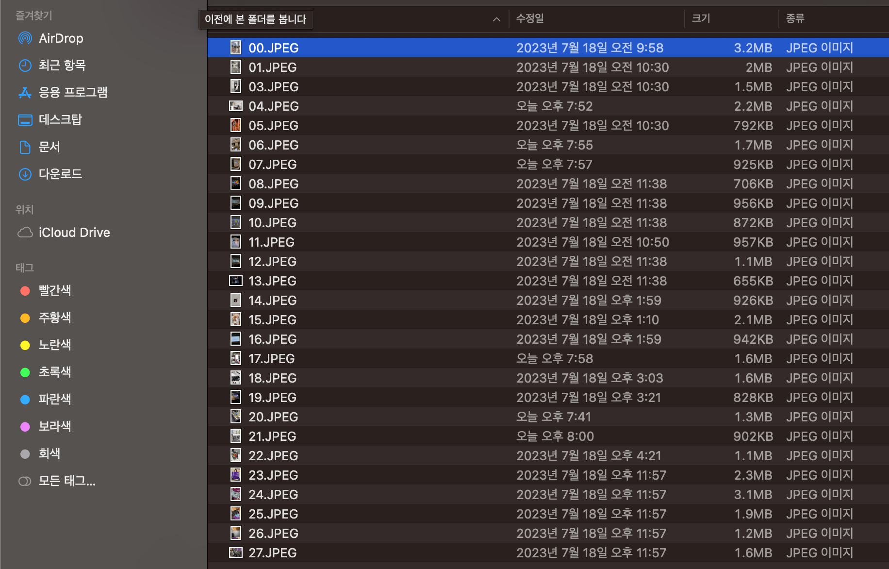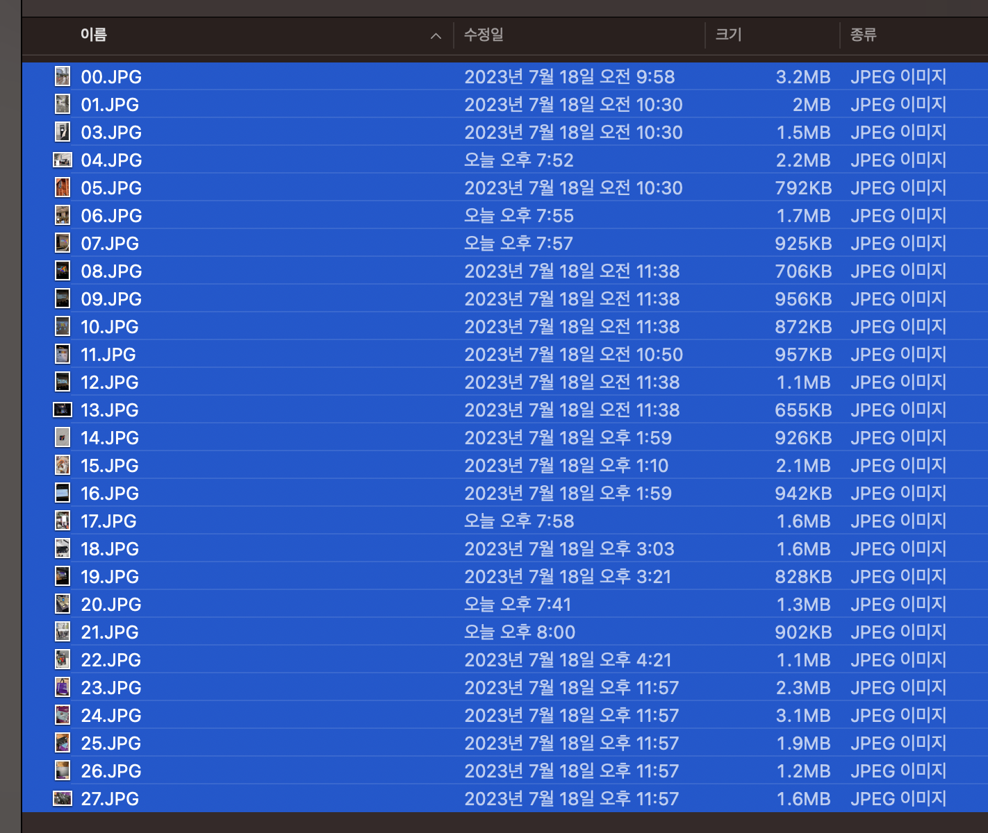 폴더 내에서 파일 하나를 선택 한 상태 -> command + A 단축키를 눌러서 전체 파일을 포커싱 해줍니다.