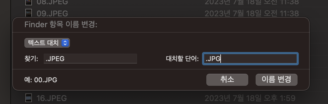 이번 예시로는 .JPEG -> .JPG로 수정해보겠습니다. 각각 찾기:, 대치할 단어: 에 키워드를 입력하신 후, "이름 변경" 을 클릭하시면 파일 이름이 일괄로 변경됩니다! 👍