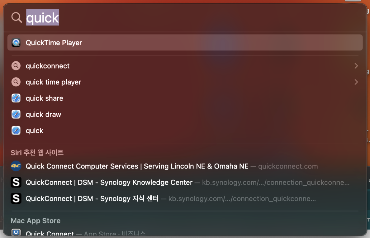 먼저, Command + Space 단축키로 Spotlight를 띄워보세요. 여기에서 우리가 화면 녹화 및 캡쳐에 사용할 QuickTimePlayer를 검색해서 Enter로 실행해주세요.