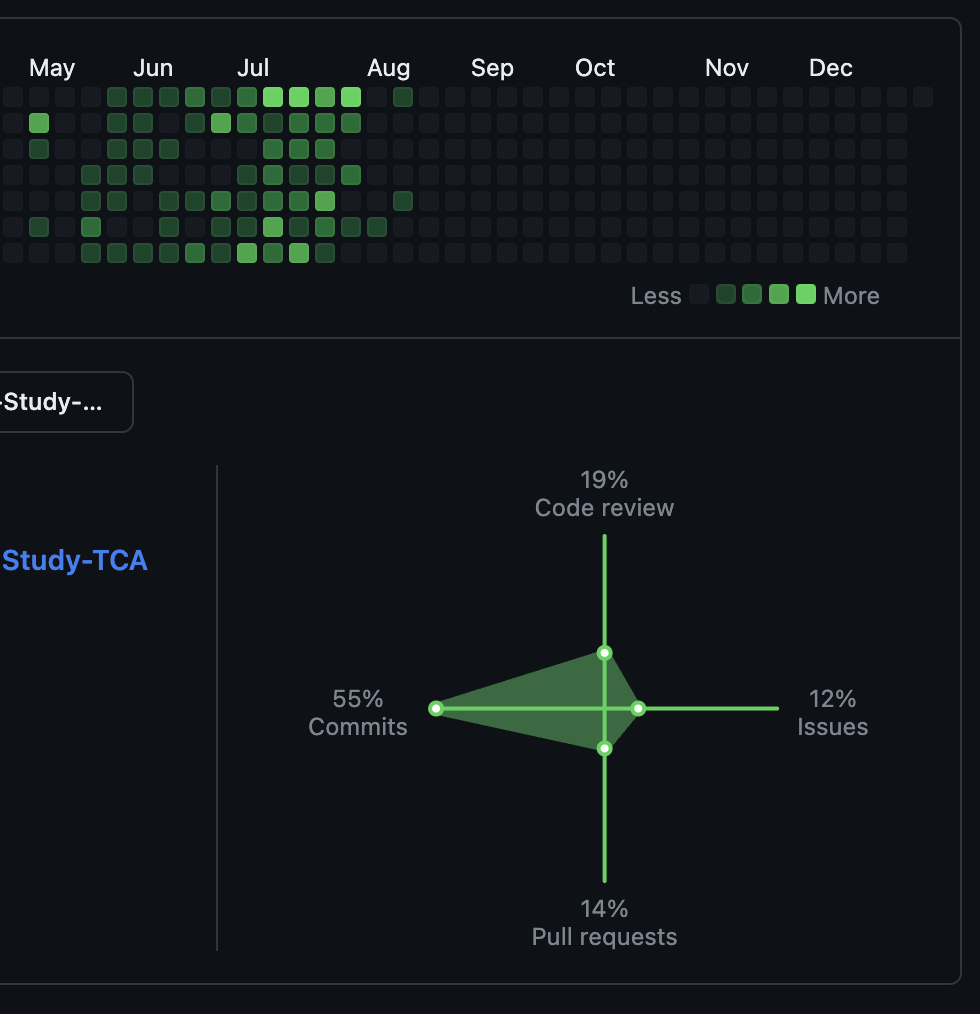 취준생 시절에 비해 commit대비 issue, PR, review 비중이 늘었다.