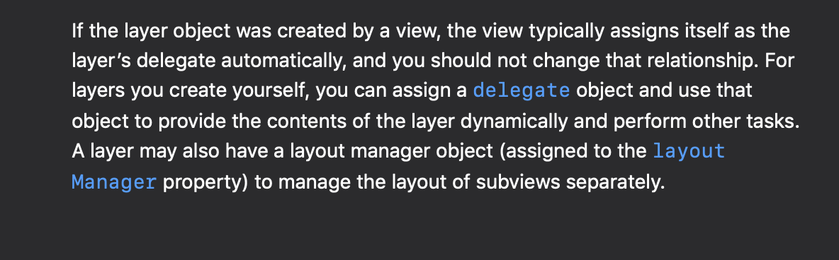 만약 레이어객체가 뷰(view) 생성에 의해 만들어졌다면, 뷰는 일반적으로 자기자신을 레이어의 대리자(delegate)로 자동 할당합니다. 당신은 이들의 관계를 변경해서는 안됩니다. 당신이 만든 레이어를 사용하기 위해서는 delegate 객체를 할당해야 합니다. 그 뒤, 동적으로 레이어의 컨텐츠를 제공하고, 다른 동작들을 실행하기 위해 해당 객체를 사용해야 합니다.
