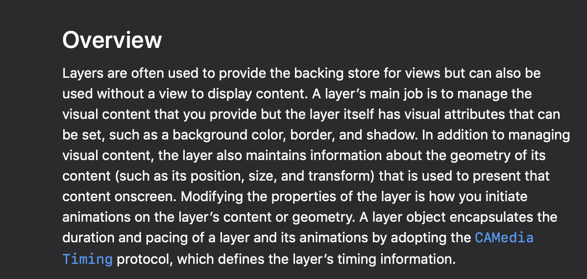 iOS 개발 입문단계에서도 알게 모르게 사용하고 있는 CALayer, 컨텐츠의 기하학적 성질, 시각적 컨텐츠 크기, 변형, 그림자효과 등 다양한 기능을 지원하는 객체입니다.(흔히 많이 쓰는 layer인스턴스가 CALayer 객체) 오늘은 iOS 컨텐츠에 대한 레이어 객체, CALayer(Core Animation Layer)에 대한 개발자 문서 개요를 함께 읽어 보겠습니다. 오역, 지적 환영합니다.