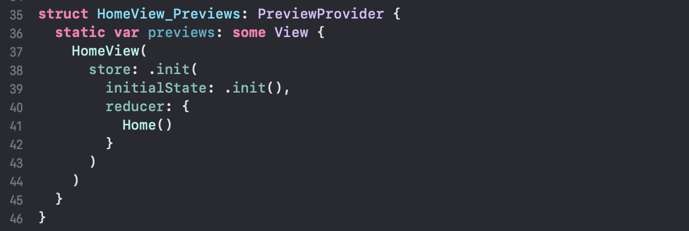 Reducer를 사용할 View쪽을 이어서 보겠습니다. 여기에서 store 멤버를 선언합니다. (StoreOf<Home>)