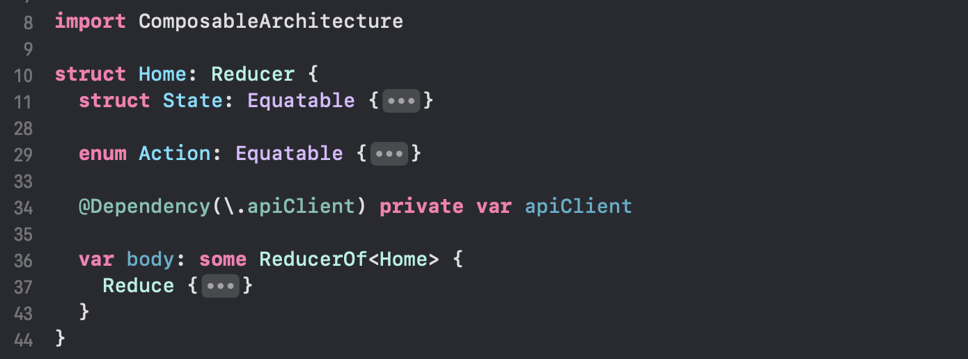 Reducer를 만들기 위해서 Reducer protocol을 채택하고, 그 안에 State 구조체, Action 열거형, body를 정의합니다. (TCA에서 전체적으로 사용하던 ReducerProtocol 키워드가 Reducer로 변경되었습니다.)