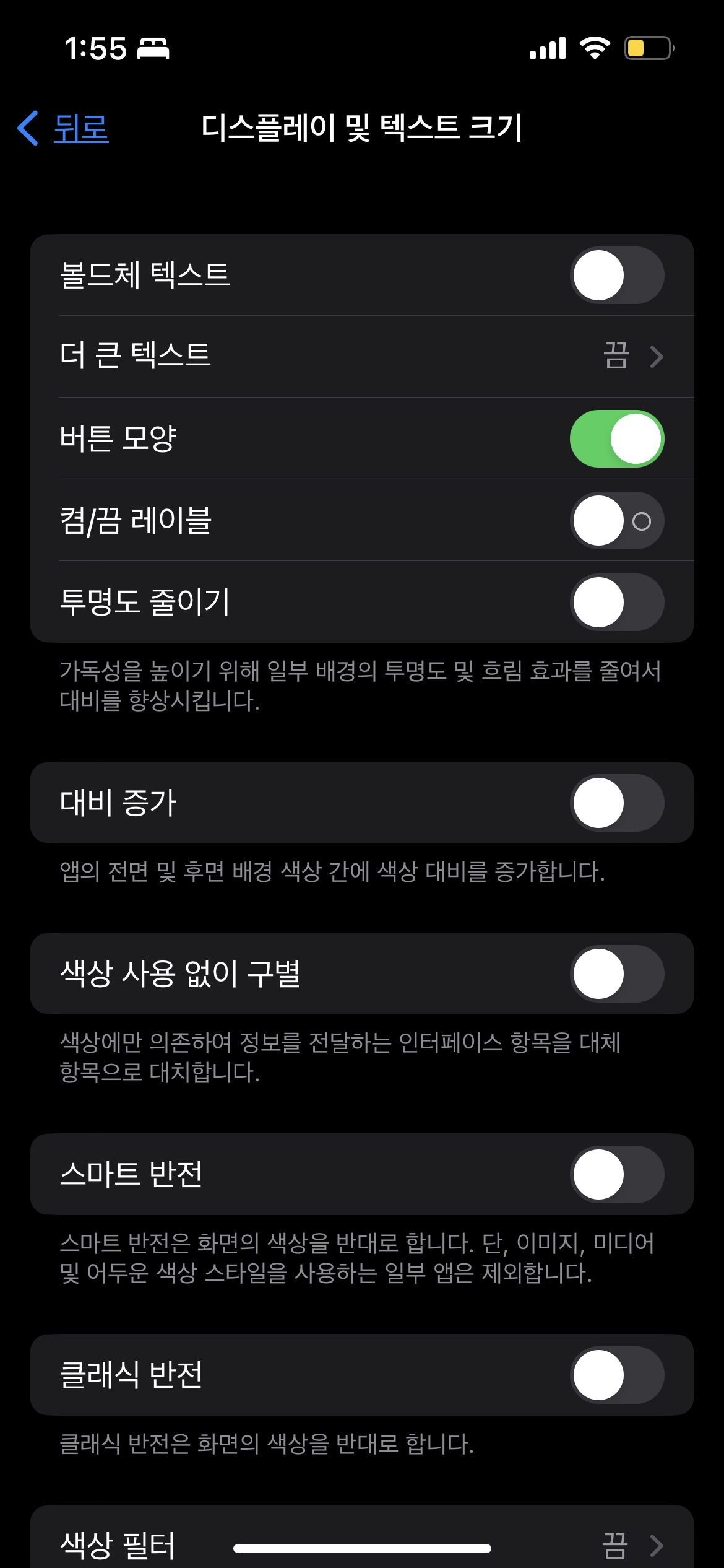 여기에서 버튼 모양 옵션을 활성화해주세요! 그게 끝입니다. 사실 개발자만을 위한 기능이 아니고, 단순 앱의 설정 옵션일 수 있지만, 개인적으로 개발 측면에서도 충분히 활용할 수 있다는 생각이 듭니다.
