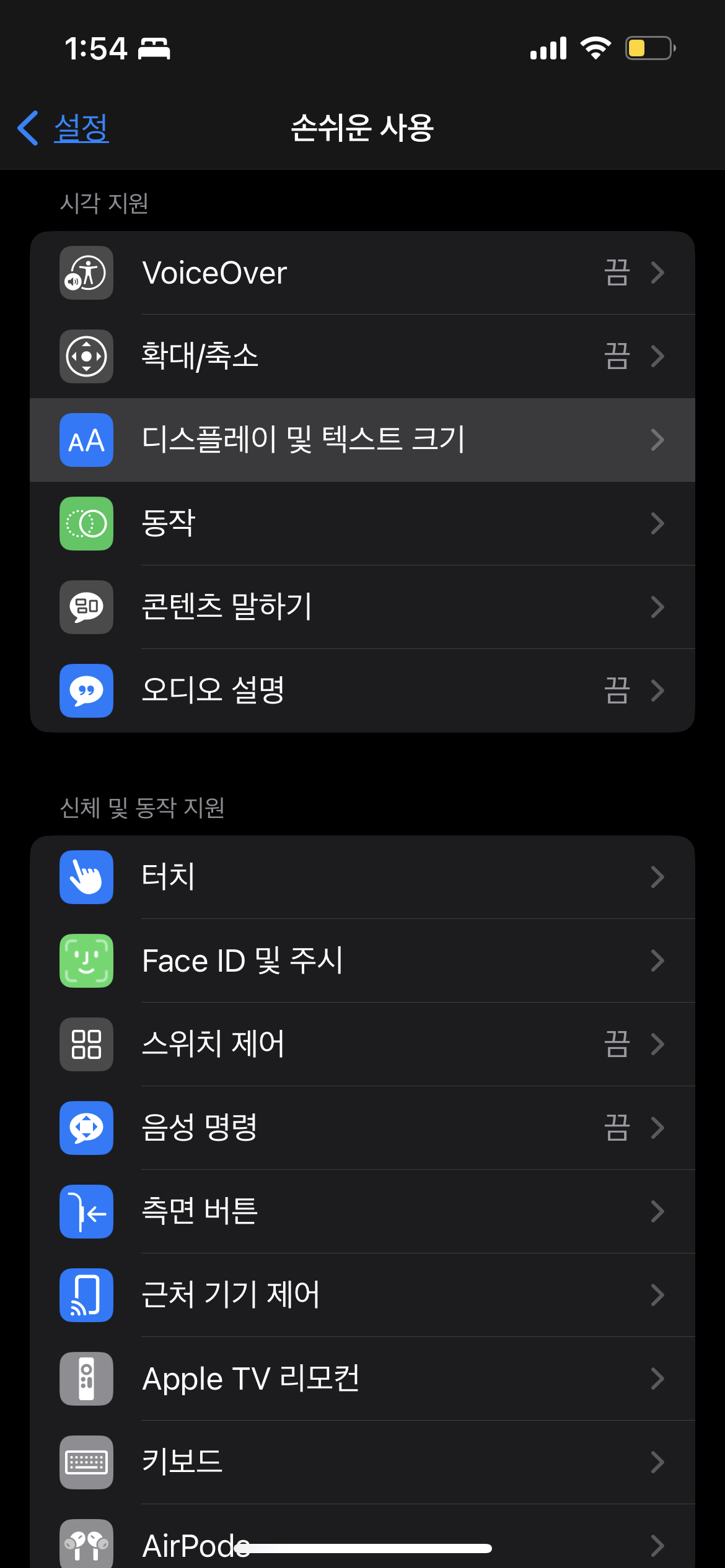 앱 설정 -> 손쉬운 사용 -> 디스플레이 및 텍스트 크기 메뉴를 선택, 화면을 진입합니다.