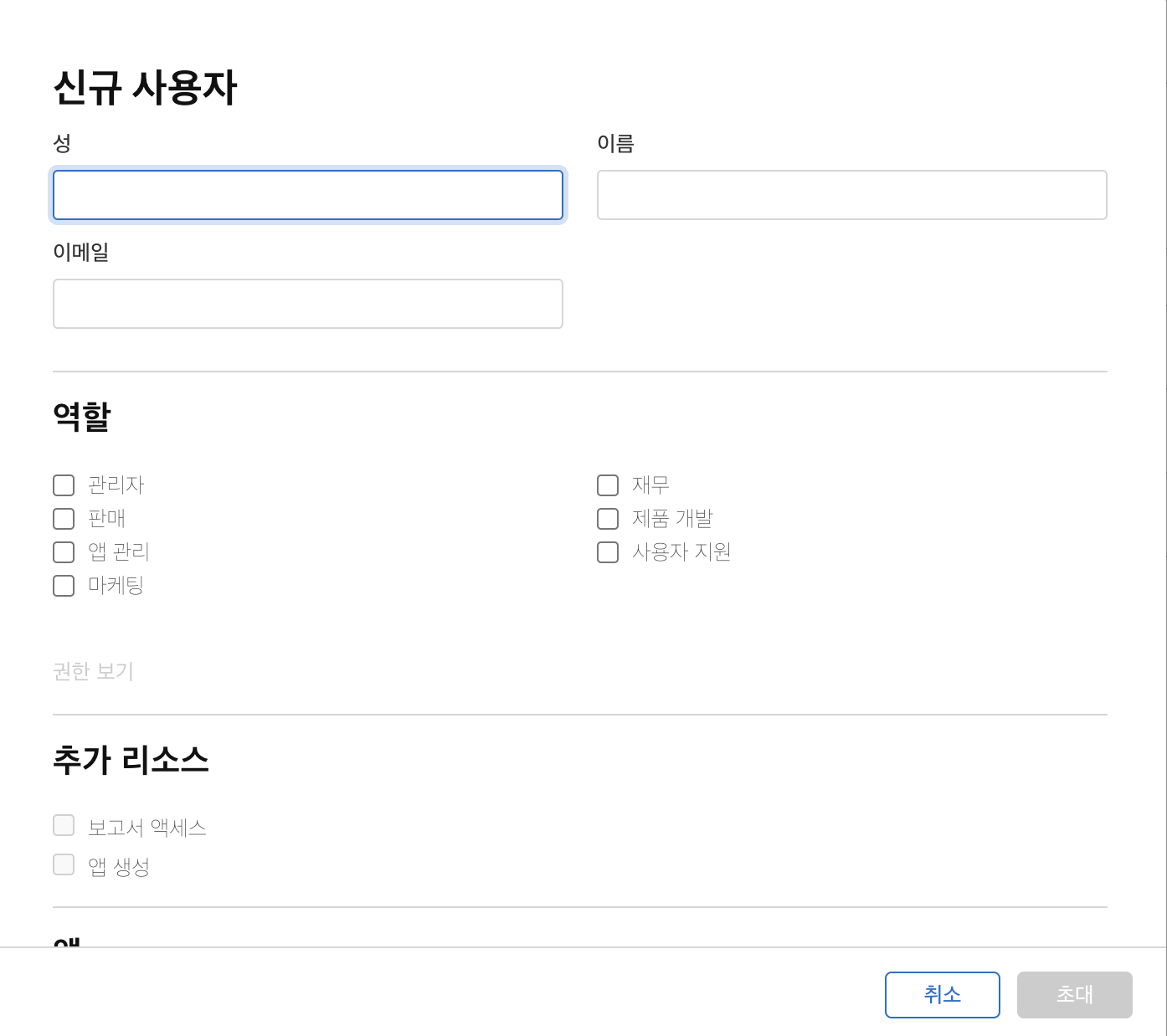 사용자 및 액세스에서 + 버튼을 선택해서 사용자를 초대할 수 있어요.