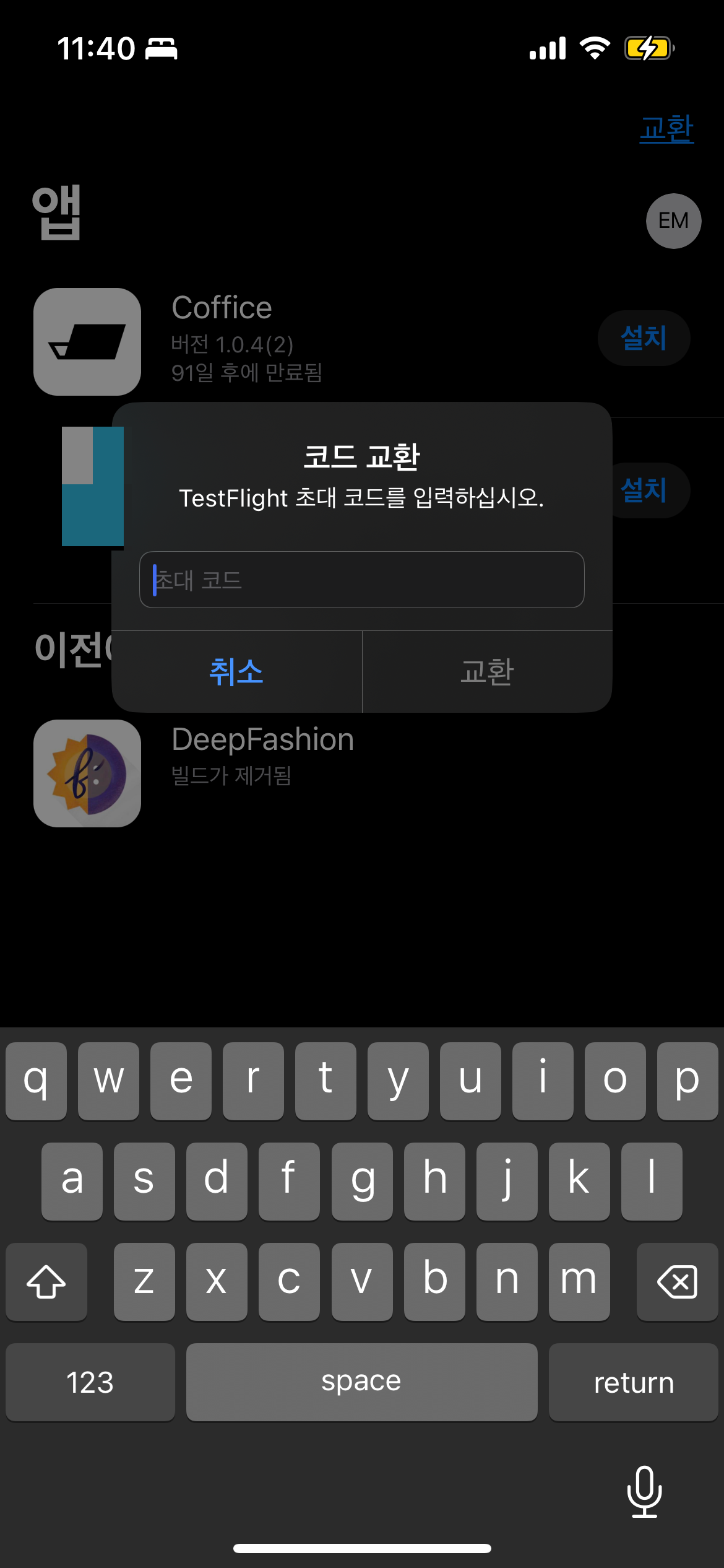 iOS앱으로 TestFlight를 받으시고, 테스트플라이트 앱의 우상단 "교환" -> 앞서 안내 메일을 통해 확인한 TestFlight 초대코드를 입력하시면, 테스트 앱을 다운로드 받아서 테스트할 수 있습니다.