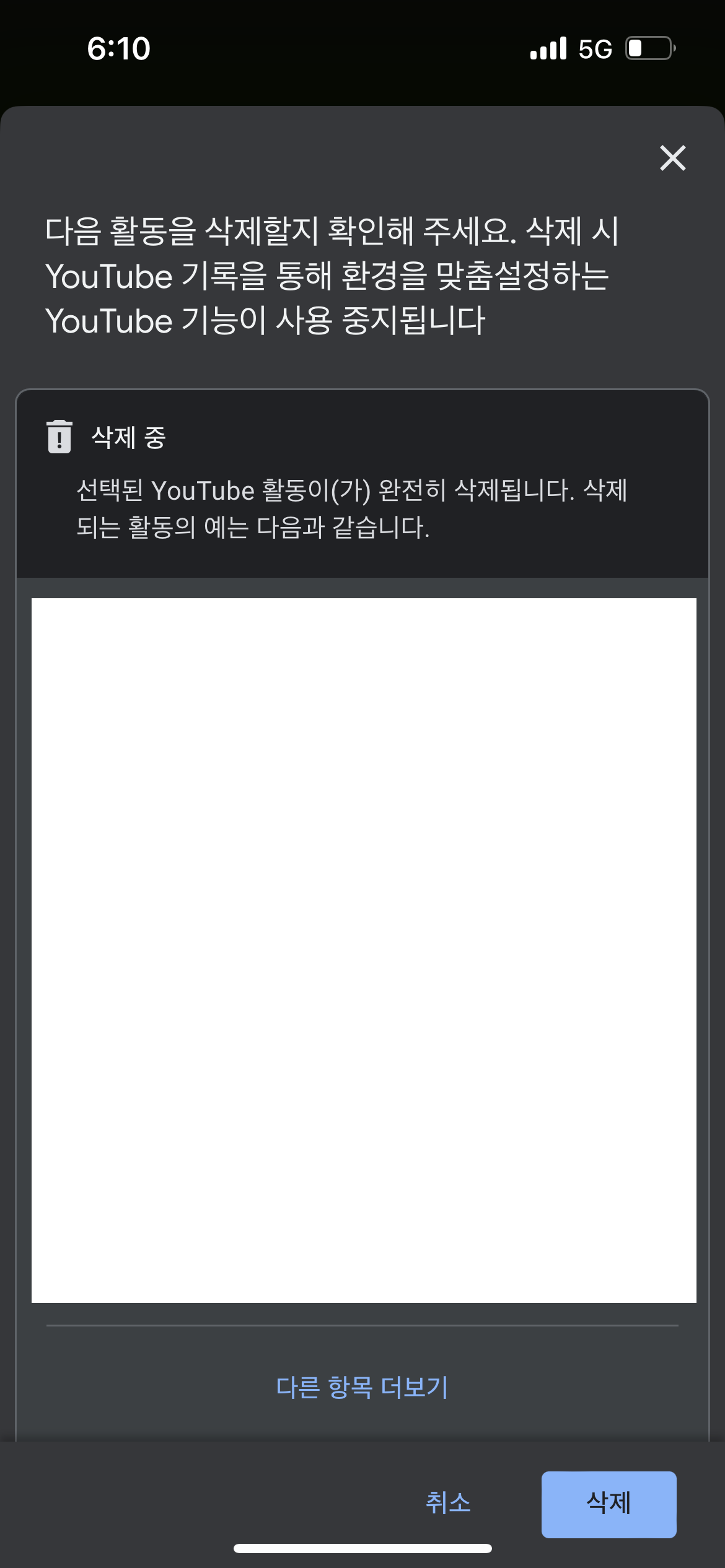 삭제될 목록을 확인해보시고, 전체 삭제 목록을 보고 싶다면, 다른 항목 더보기를 통해 보실 수도 있습니다. 정말 기록 삭제를 결심하셨으면, 이어서 삭제버튼을 선택해주세요.
