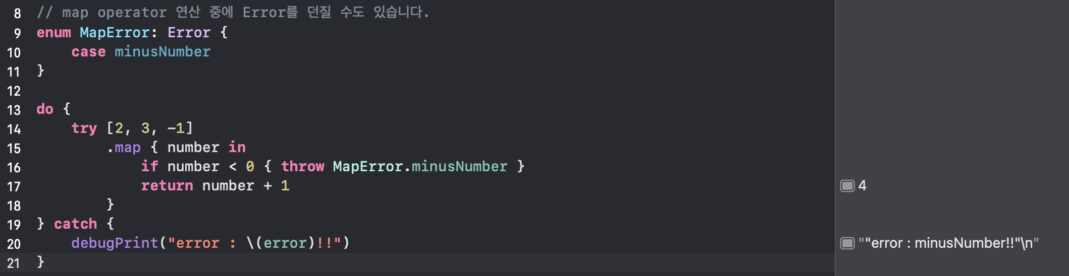 Map 연산자는 앞서 정의부에서 봤듯이, 에러를 던질 수 있습니다. Map 연산 과정에서 에러가 던져지면, 그에 맞게 에러 처리를 할 수가 있습니다.