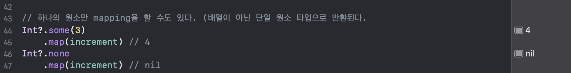 Swift의 중요한 개념 중 하나인 Optional은 none, some의 두가지 case를 가진 enum 열거형 타입으로 되어있는데요, some, none case를 활용해서 단인 원소만 특정 연산으로 맵핑하고, 그 결과를 사용할 수도 있습니다.
