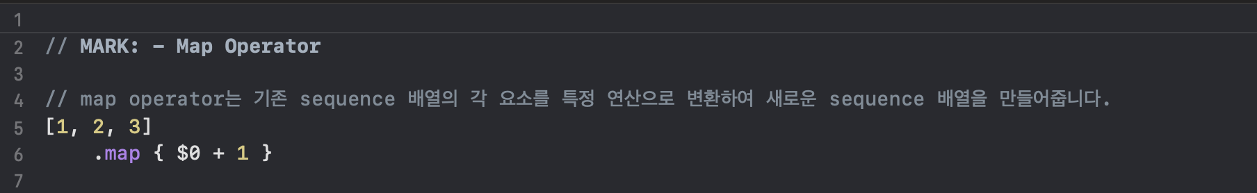 공식 문서에서 나왔듯이, [1, 2, 3] 과 같은 Collection 배열에서 map operator 사용이 가능합니다. 해당 Sequence의 element 값을 1씩 증가시키는 연산을 하고 있습니다. 결과적으로 [2, 3, 4]를 결과로 반환합니다.
