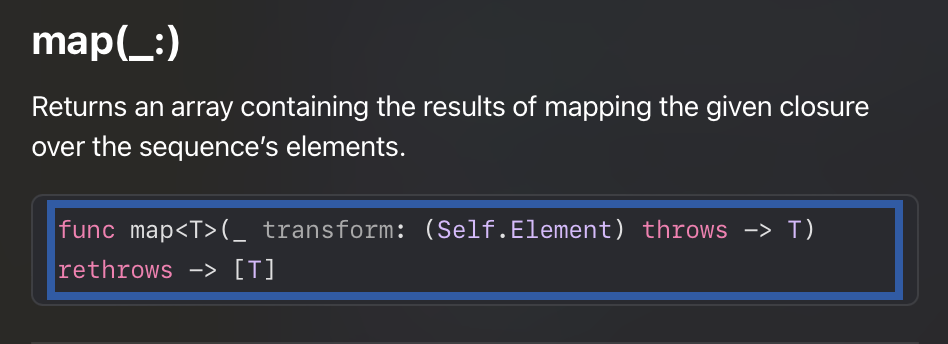 배열을 다룰때 사용되는 Collection과 관련된 map 연산자에 대한 문서 개요를 보겠습니다. 하나의 클로져를 받는데, 클로져에서 특정 연산을 수행하고, 결과를 반환합니다. 이때 클로져 내에서 에러를 던질 수도 있습니다.