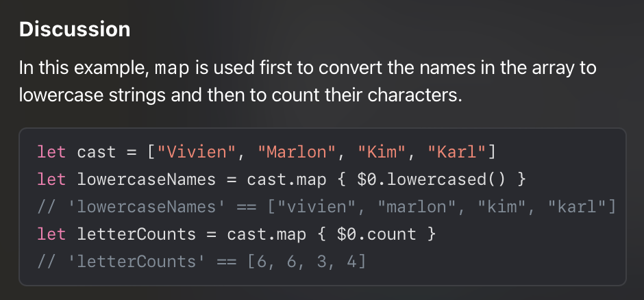 Map Operator 관련 문서의 예시를 보겠습니다. [String] 타입의 배열을 map 연산자로 맵핑을 하고 있습니다.