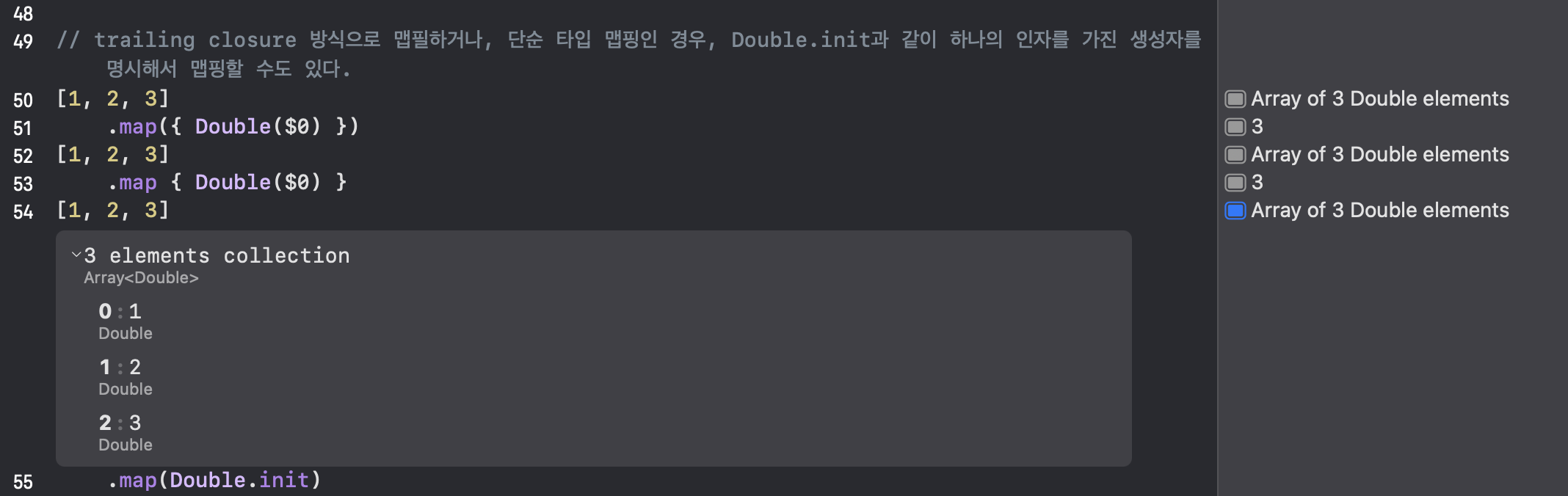일반적으로 사용되는 51, 53라인의 클로져를 인자로 넣거나, trailing closure를 활용하는 방식 외에도 간단한 타입 맵핑이 필요한 경우, 55번 라인처럼 Double.init 과 같은 단일 인자를 가진 생성자를 사용해서 맵핑을 할 수도 있습니다.