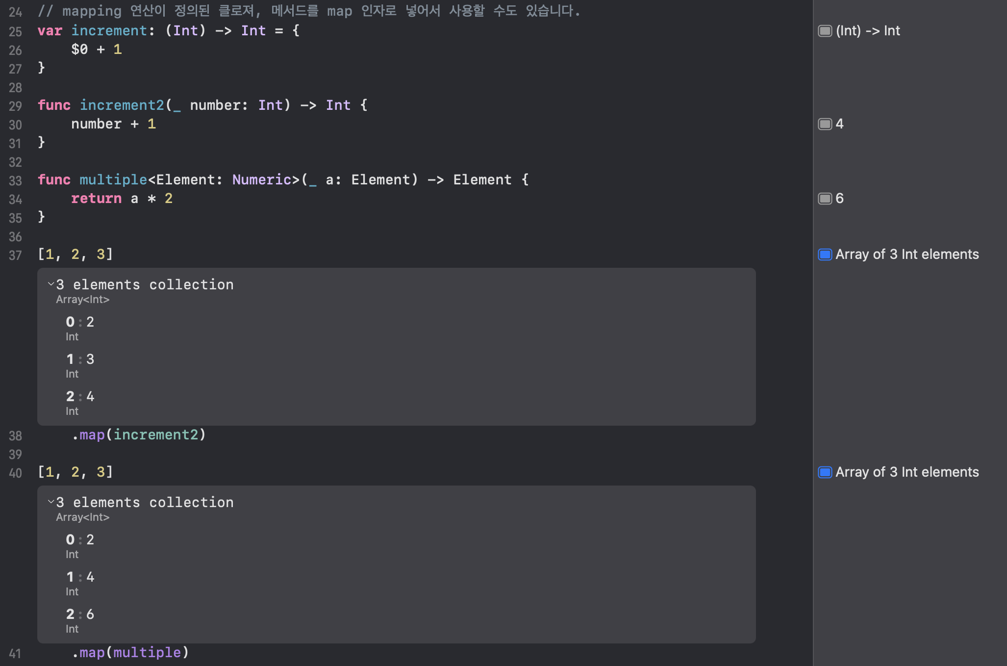 위에 정의된 increment, increment2, multiple 모두 map 연산자의 인자로 사용되어서 다양한 맵핑 연산을 수행할 수 있습니다. 단, 사용을 위해서는 원본 Collection 배열의 Element 타입을 맞춰주어야 합니다.