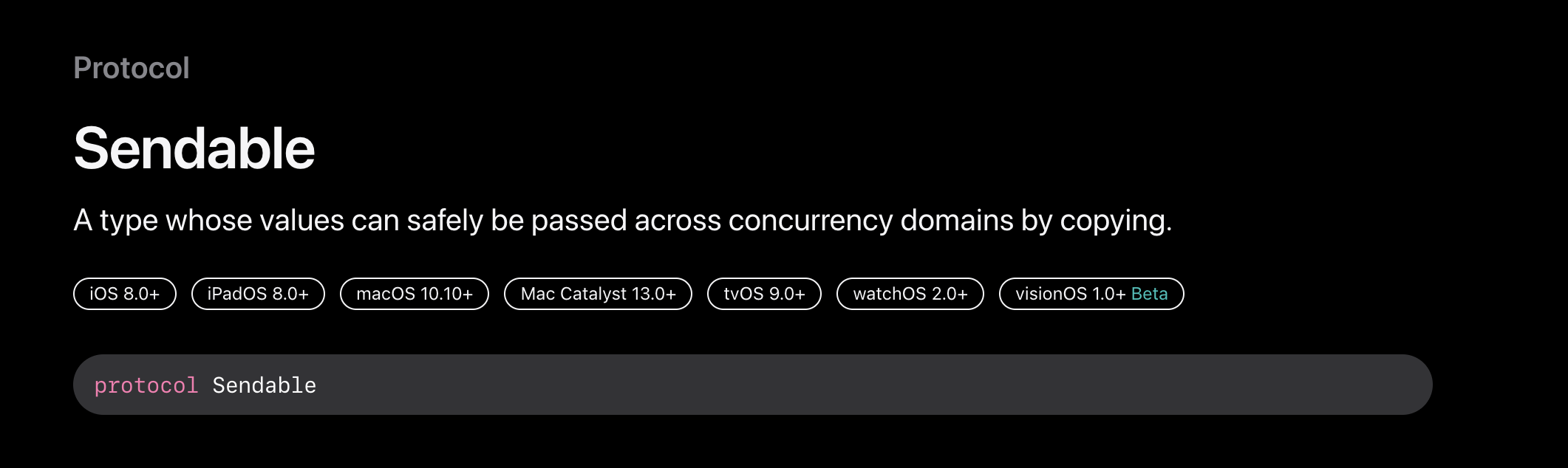오늘은 Sendable protocol 문서를 읽어보고자 합니다. Sendable protocol의 요약 설명을 보면, 복사에 의해 Concurrency 도메인 간에 값을 안전하게 전달할 수 있도록 한다고 하는데, 문서를 보도록 하겠습니다.