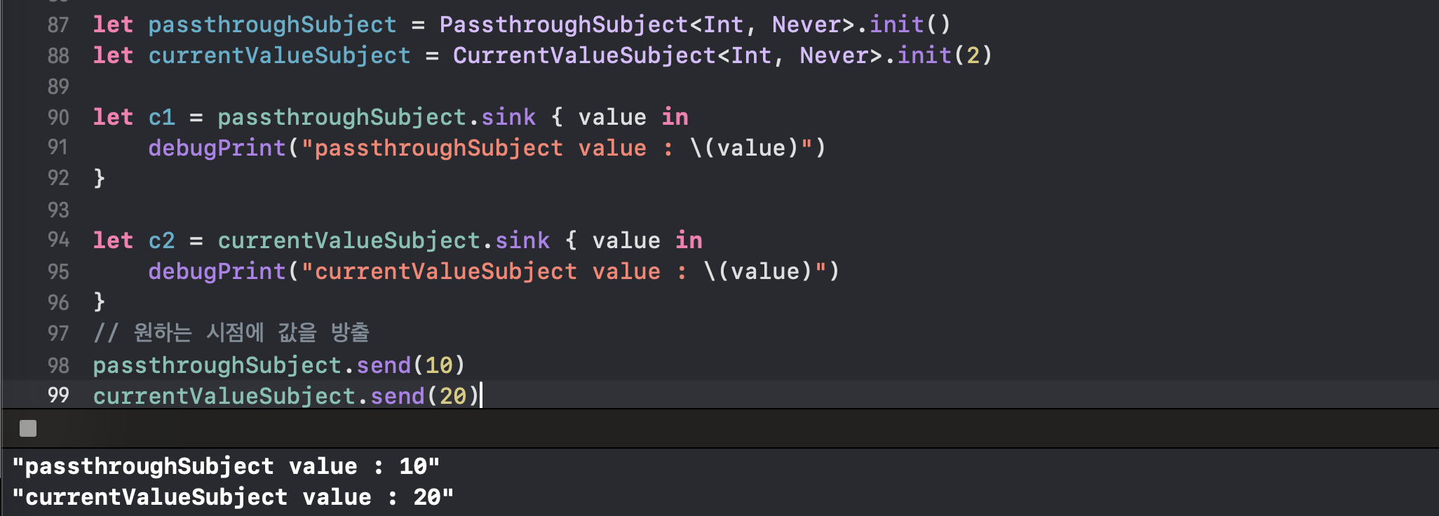 초기값을 가지고 있는 CurrentValueSubject나 초기값이 없는 PassthroughSubject를 사용해서 원하는 시점에 값을 send, 구독자에게 방출할 수 있습니다.