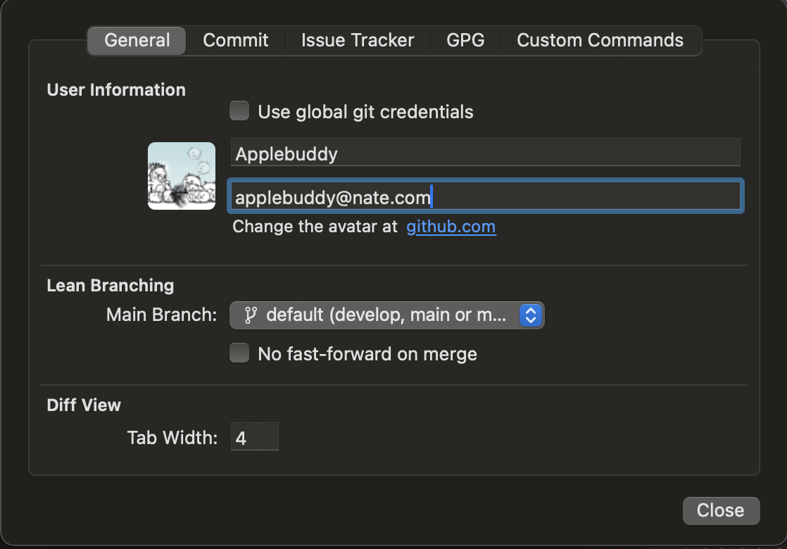 User global git credentials 체크박스가 설정되어있을 경우에는 해당 체크박스를 해제해주시고요. 본인이 사용하고자 하는 계정 메일과 닉네임을 설정해주세요. 이때 본인이 알맞게 입력했다면, 본인의 계정 섬네일 이미지가 보일거에요. 그것까지 확인하면 됩니다.