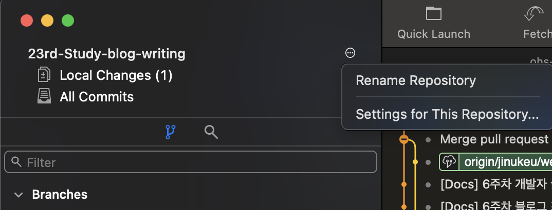 Fork에서 사용자 설정을 하고 싶은 Repository를 열어주세요. 그리고, 해당 Git Repository의 우측에 더보기 아이콘 버튼이 작게 있을건데요. 이걸 선택 -> Settings for This Repository... 메뉴를 선택합니다.