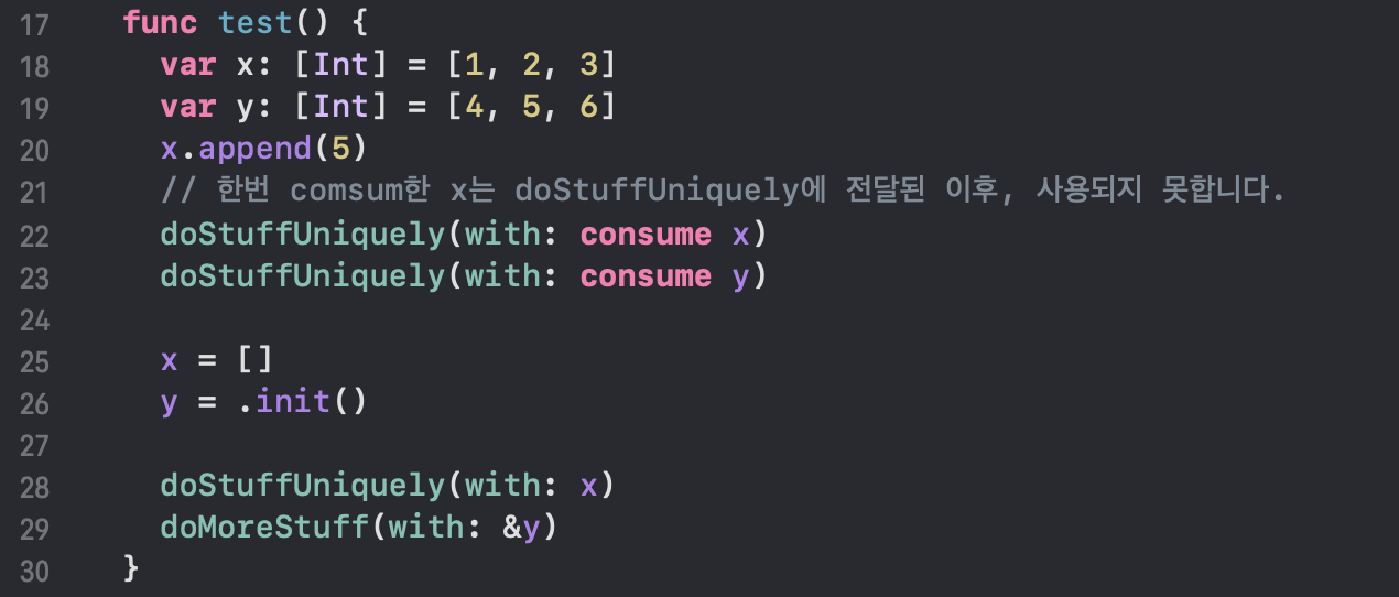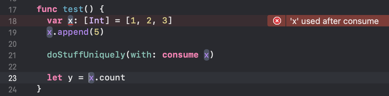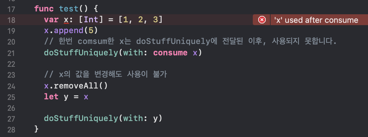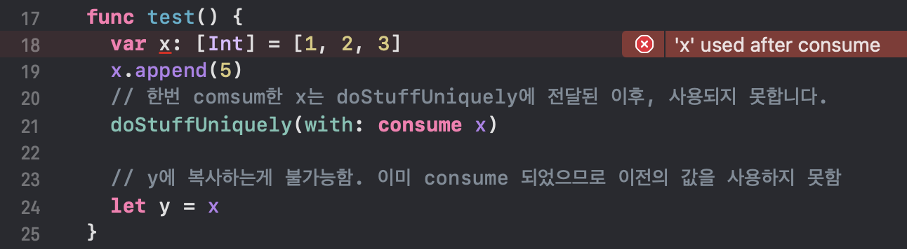 doStuffUniquely 메서드에 x가 전달되는데, consume 예약어를 명시하고 있습니다! 이렇게 consume 되어진 x를 24번 라인에서 y 상수에 복사하려고 하지만, 컴파일 타임 에러가 발생합니다. 'x' used after consume. 즉, consume 된 이후에는 사용이 불가능하게 되는 것입니다.