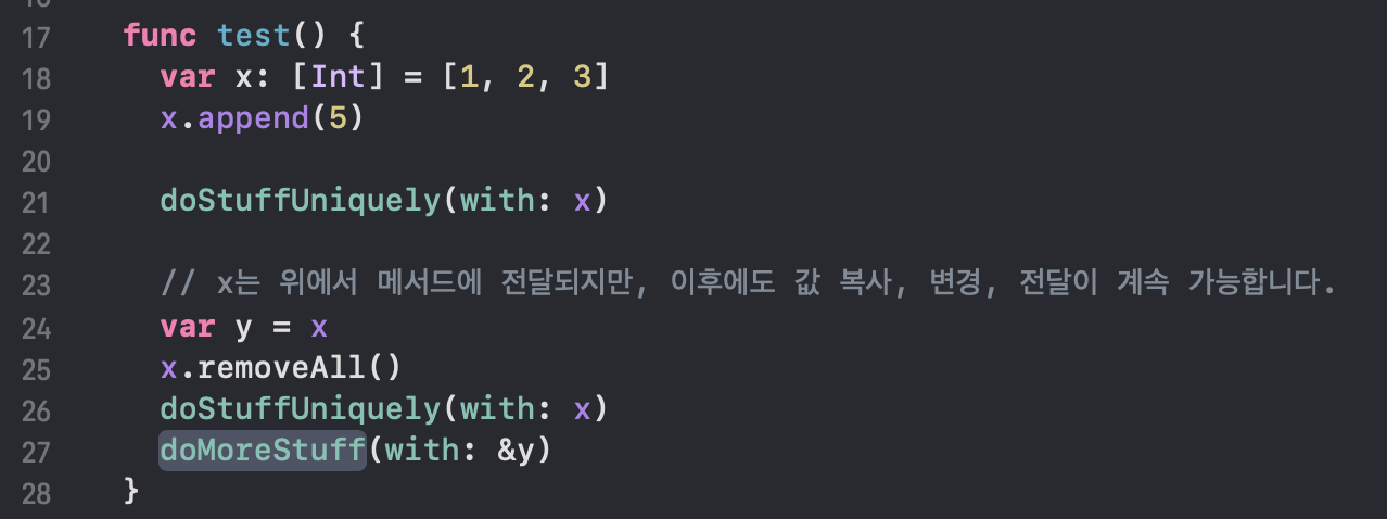 일반적으로 볼 수 있는 코드입니다. x라는 배열은 메서드에 전달된 이후에도 다른 변수, 상수에 복사되거나 초기화 없이 값을 변경할 수도 있고, 또 다시 다른 메서드에 반복해서 전달될 수도 있습니다.