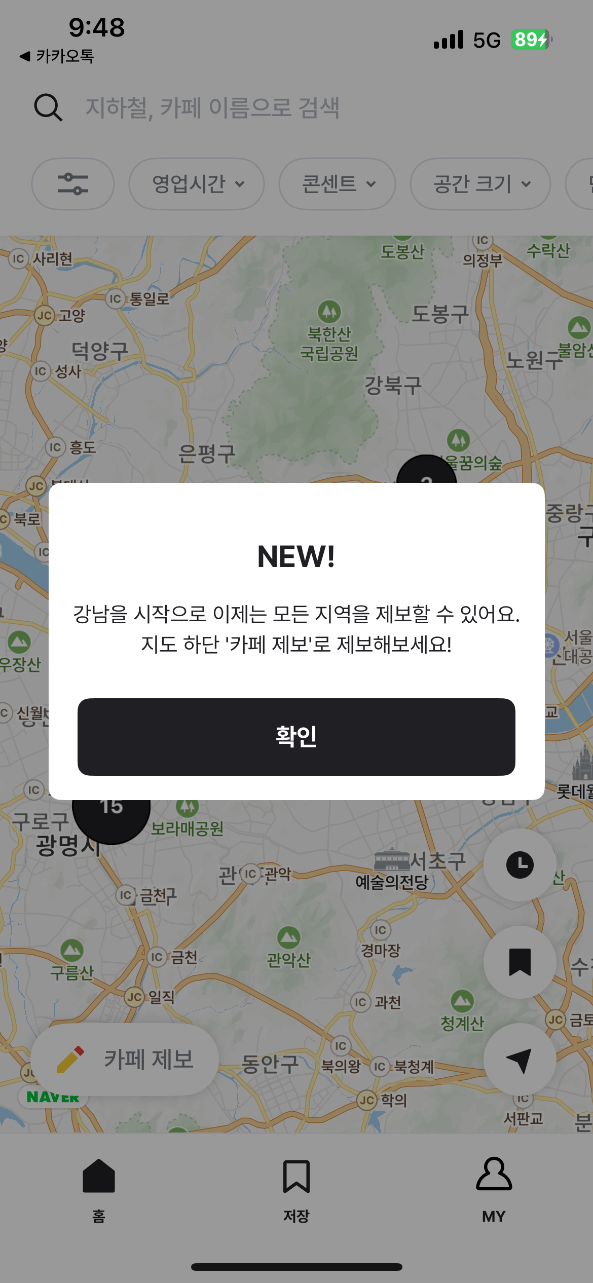 공부하기 좋은, 작업하기 좋은 카페를 직접 제보하실 수도 있어요! 메인화면 좌하단의 "카페 제보" 버튼을 클릭 하시고, 카페 제보를 하실 수 있습니다.
