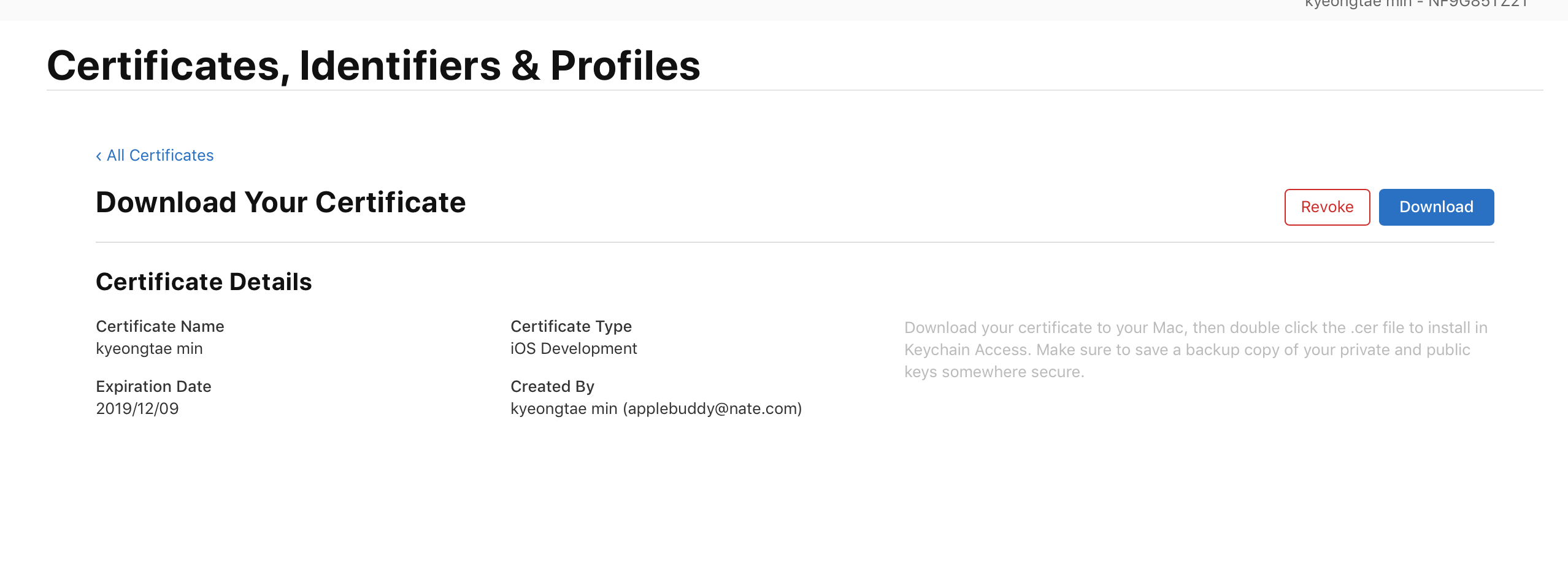 위의 페이지는 각각의 개발자 증명서에 대한 정보를 보여주는데요 저기에서 우측 중앙에 보이는 Download를 통해 증명서를 설치해줍니다. 설치한 파일은 바로 더블클릭하여 실행해줍니다.