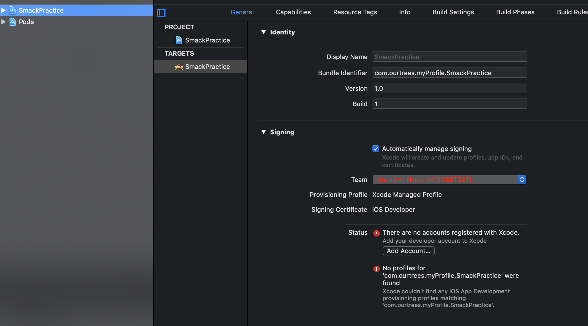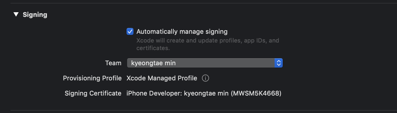 Xcode의 프로젝트를 좌측 목록에서 선택 후, General 탭의 Team을 눌러줍니다.