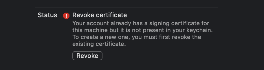아직 키체인을 통해 제 증명서 계정을 인식하기 못하고 있습니다. Revoke를 한번 눌러줍니다.