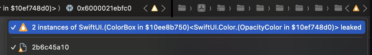 Debug Memory Graph를 열면 우상단에 위와 같이 leaked 경고도 확인해볼 수 있고, 경고를 선택하면 이와 관련된 메모리 리스트 항목도 확인가능하니, 추가적으로 참고할 수 있어요.