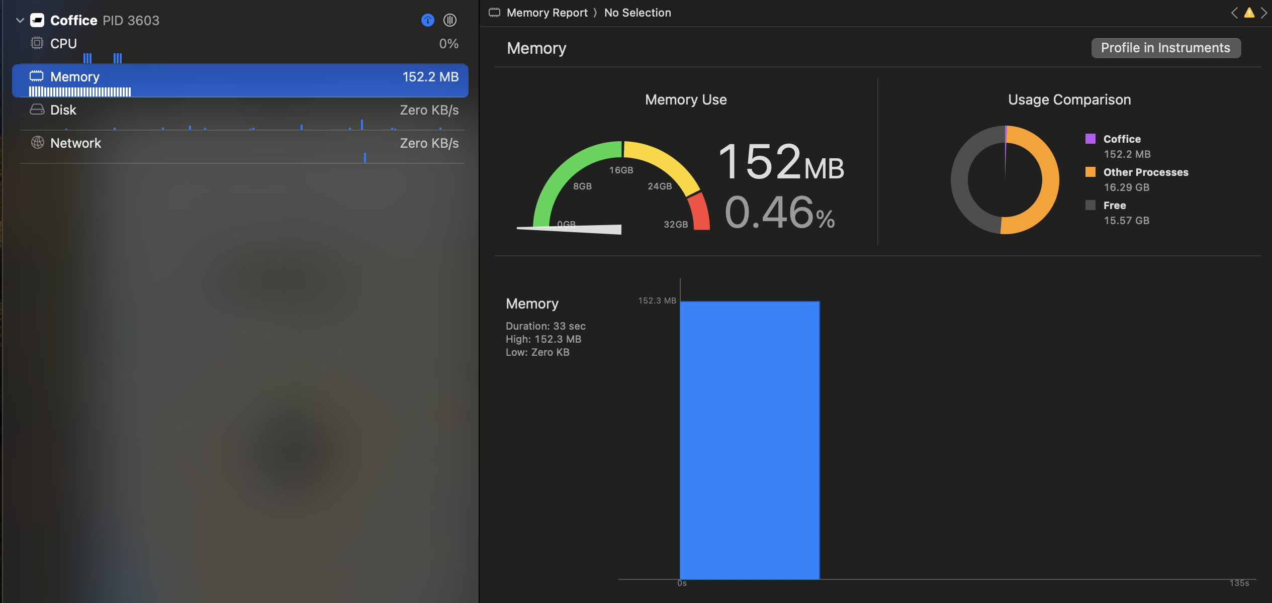 다들 아시겠지만, 런타임 상태에서 상단의 "show the debug navigator" 메뉴를 탭하면 위와 같이 CPU, Memory 등의 상태를 실시간 확인이 가능하답니다. 만약 무거운 기능의 화면에 대해 메모리릭 현상이 발생하면 여기에 눈이 띄는 이상 현상이 감지 될 수 있어요. 그런 부분도 메모리릭을 유추해볼 수 있는 부분이라고 할 수 있습니다.