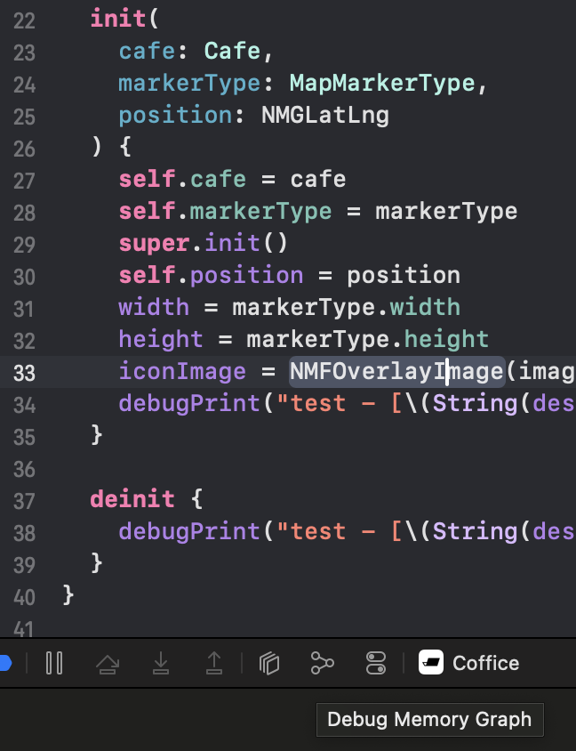 Xcode 하단 메뉴바 상단 띠를 보시면 UI 계층 캡쳐, 메모리 그래프 등의 옵션이 있는데요. 이중에 동그란 원 3개가 이어져있는 아이콘 모양을 선택하면, Debug Memory Graph를 보실 수 있어요.