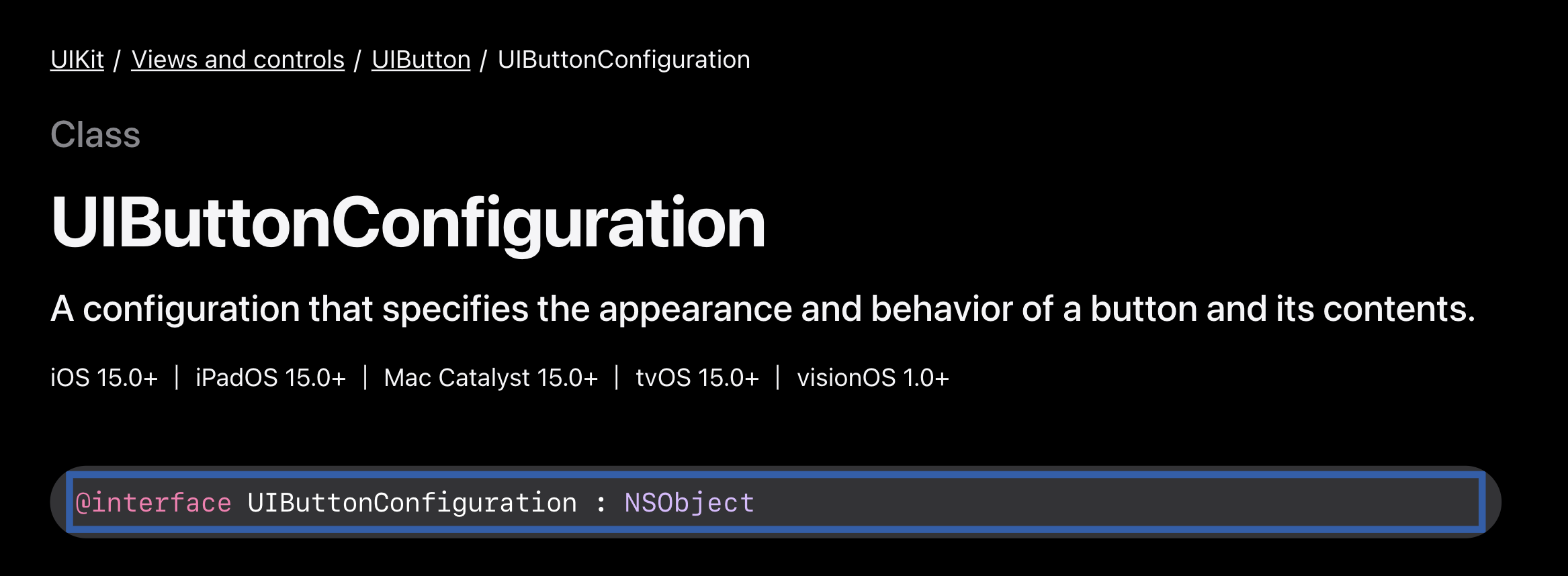 이 기능을 objective-c에서는 클래스, swift에서는 UIButton.Configuration 타입의 구조체 방식으로 제공을 하고 있었어요. 양쪽 언어 전부 iOS15 이상부터 지원을 해요.