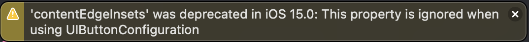 앞서 언급했듯이, UIButtonConfiguration은 iOS 15.0 이상 부터 지원하며, 기존에 contentEdgeInsets을 설정해서 사용했다면, 노란경고를 경험하실 수 있어요. 위와 같이 UIButtonConfiguration을 사용하면 contentEdgeInsets이 무시된다면서 contentEdgeInsets가 deprecated 되었음을 알려줍니다.