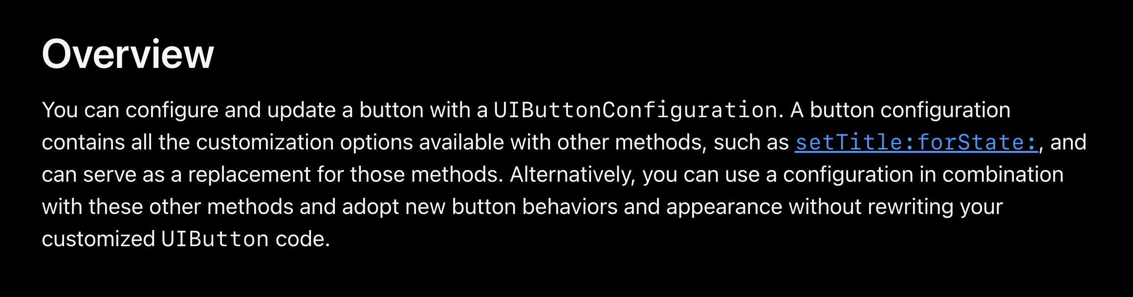 오늘은 UIButton의 contentEdgeInsets 멤버 설정 코드에서 deprecated 경고가 발생했던게 기억나서, 이걸 대체해서 iOS15 이상에서 사용 가능한 UIButtonConfiguration(UIButton.Configuration)에 대한 개발자문서 개요를 읽어봤어요.
