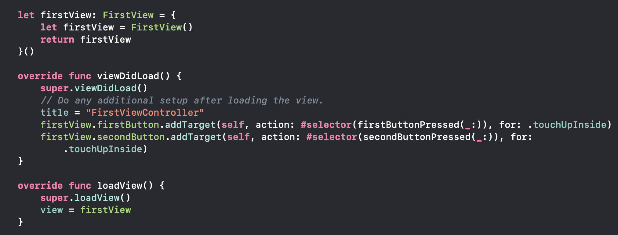 firstView.firstButton.addTarget(self, action: #selector(firstButtonPressed(_:)), for: .touchUpInside)