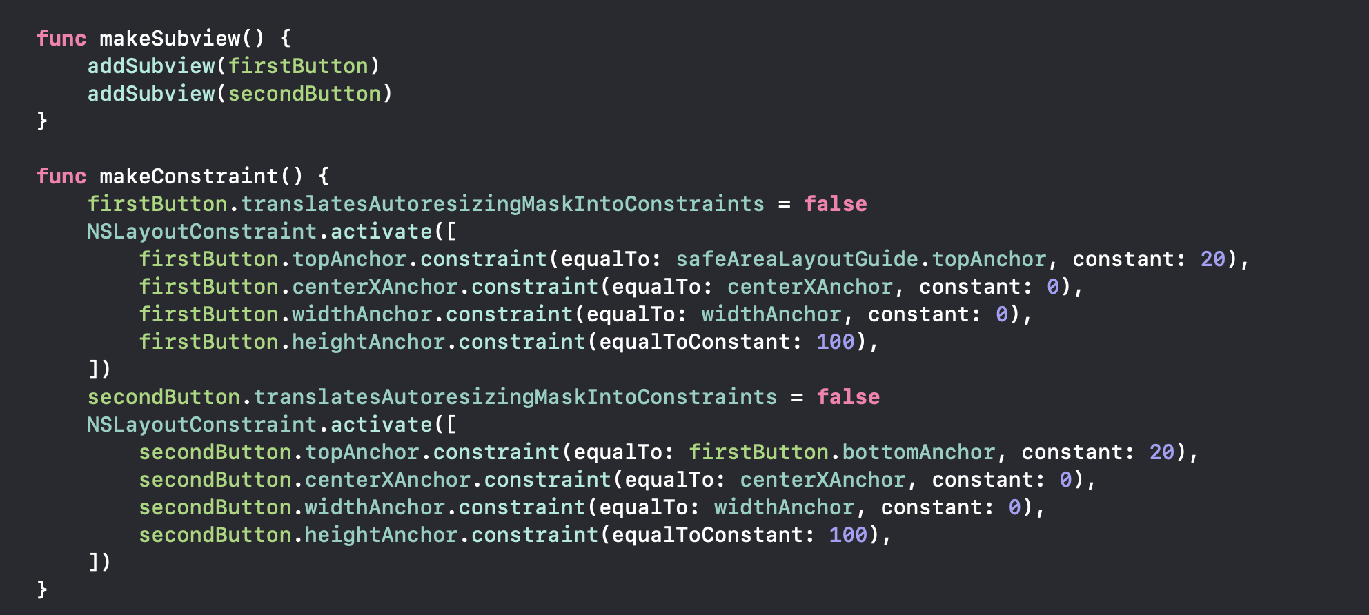makeConstraint() 메서드에서는 버튼 두개에 대한 제약값을 간단하게 주었습니다.