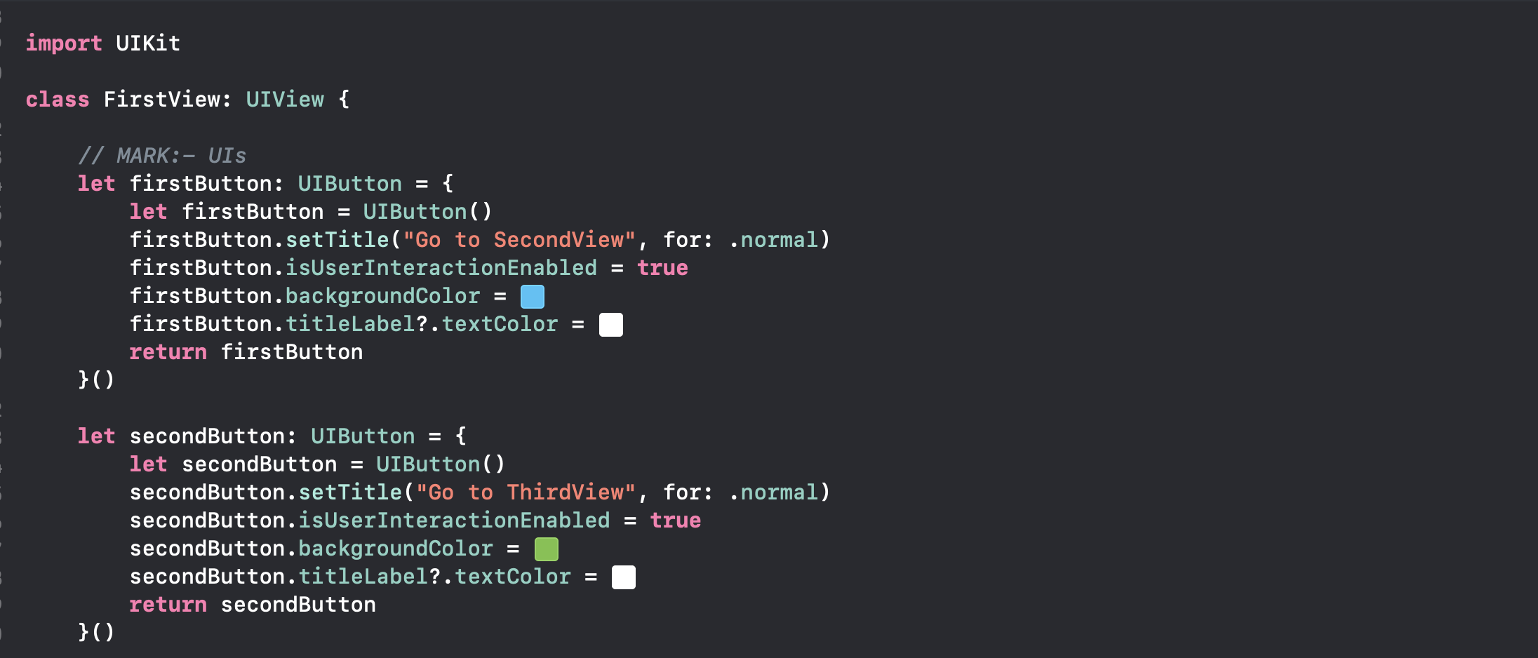 FirstViewController 이외로 SecondViewController, ThirdViewController는 비슷한 소스코드로 되어있기에 생략합니다.
