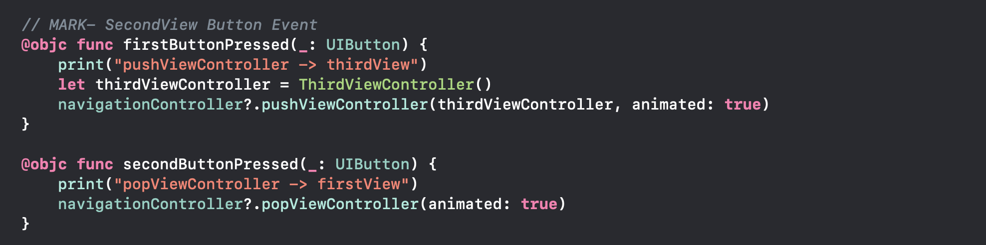 secondViewController의 버튼이벤트입니다. 첫번째 버튼의 이벤트는 앞서 설명한 내용으로 생략하겠습니다.