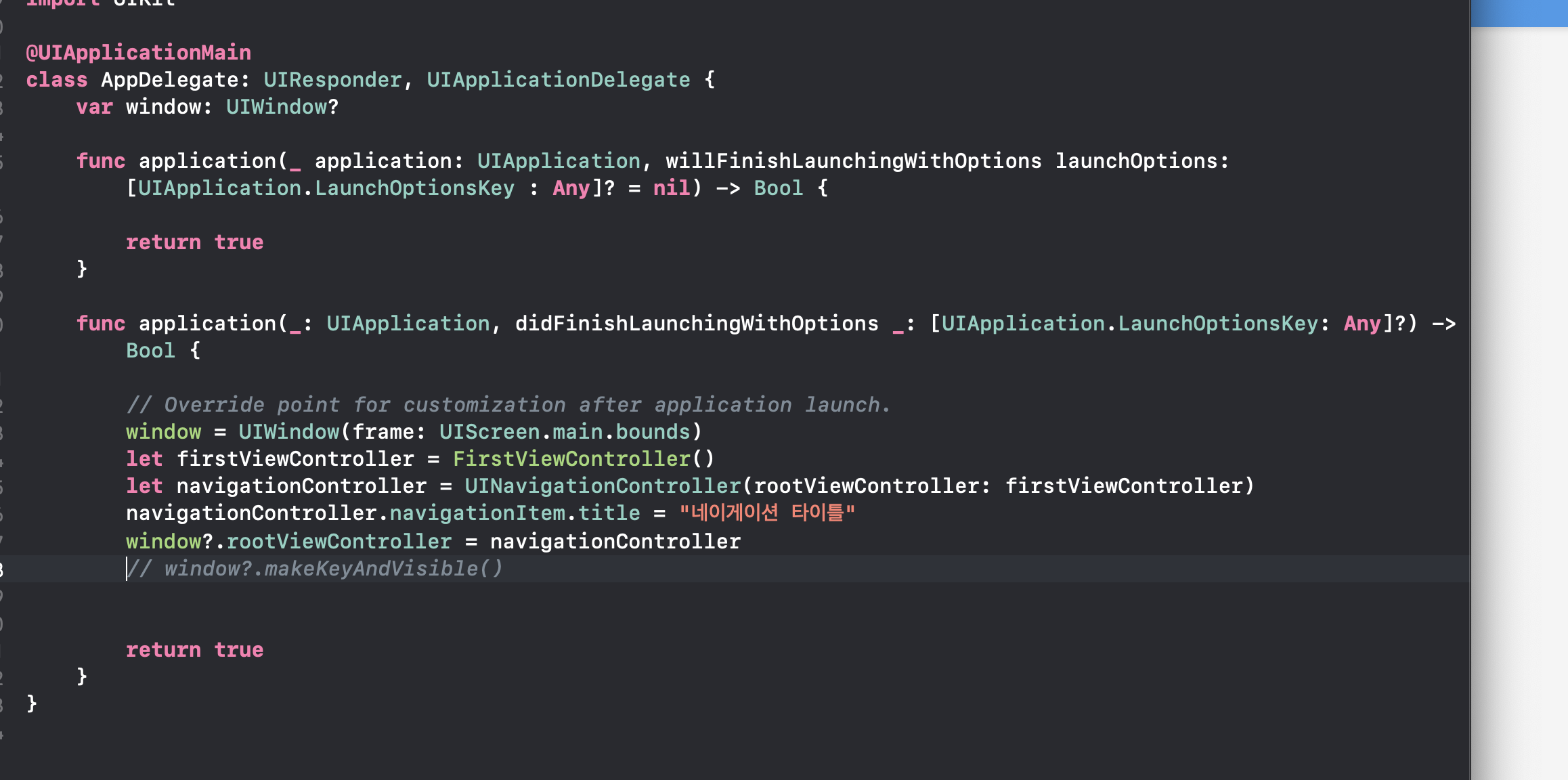 싱글턴 클래스인 AppDelegate에서는 앱의 생명주기를 관리합니다. 여기서 먼저 기본 네비게이션컨트롤러와 네비게이션컨트롤러에 맨 처음 띄울 뷰컨트롤러를 정의해 주려고 합니다.