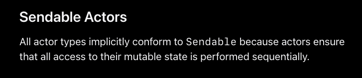 💡 참고: Actor는 내부적으로 Sendable 프로토콜을 암시적으로 따릅니다. (즉, 특별히 선언하지 않아도 Sendable로 간주돼요.)