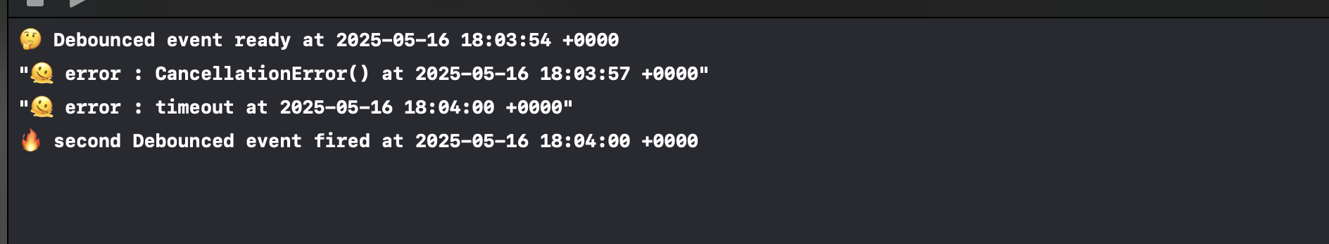 print("🔥 fisrt Debounced event fired at \(Date())")