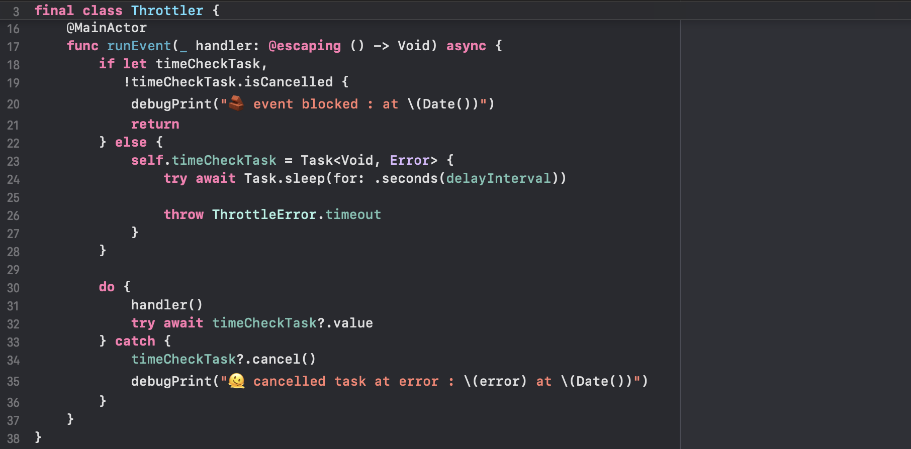 Swift의 Task, @MainActor, async/await만으로도 throttle 기능을 꽤 심플하게 구현할 수 있답니다. Combine 없이도 가능하다는 점에서, 더 유연한 커스터마이징이 필요할 때 매우 유용하겠죠?