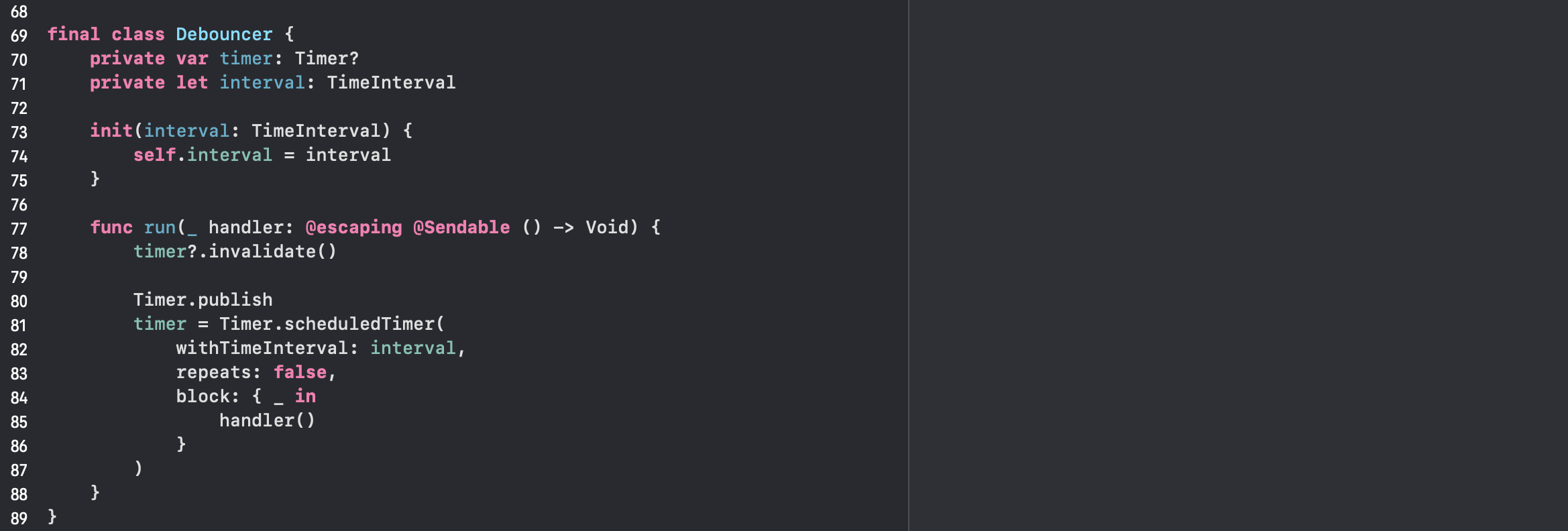 간단한 기능 구현시에는 이렇게 러닝커브 낮고, 심플한 Timer 한 줄이 깔끔하고 유지보수에 좋을 수도 있는 것 같아요. 다양한 옵션을 활용할 줄 아는게 좋은 것 같습니다. Combine framework에서 기본적으로 debounce, throttle operator를 제공하긴 하니까요. 여러 옵션 알아두시면 좋을 것 같습니다.
