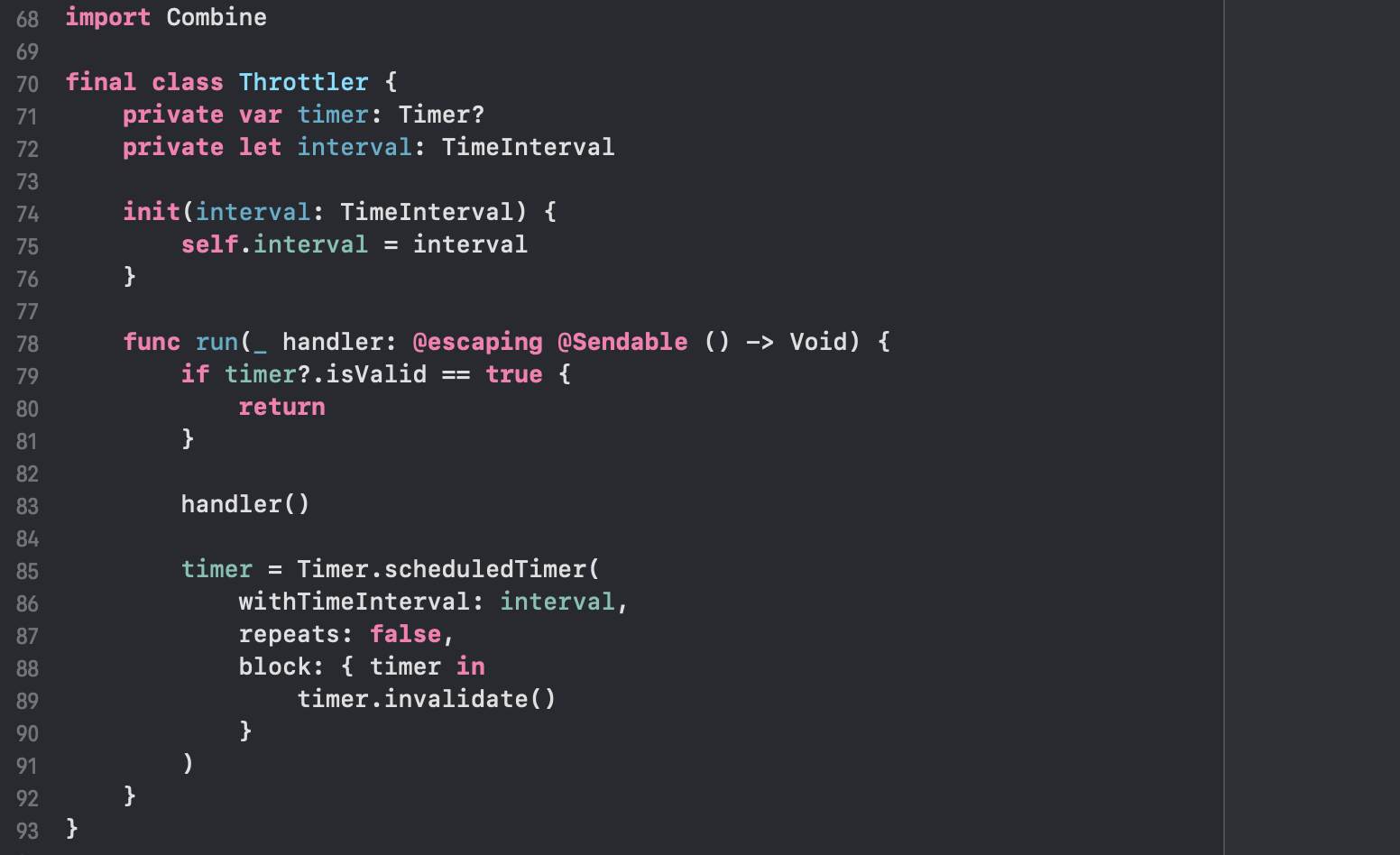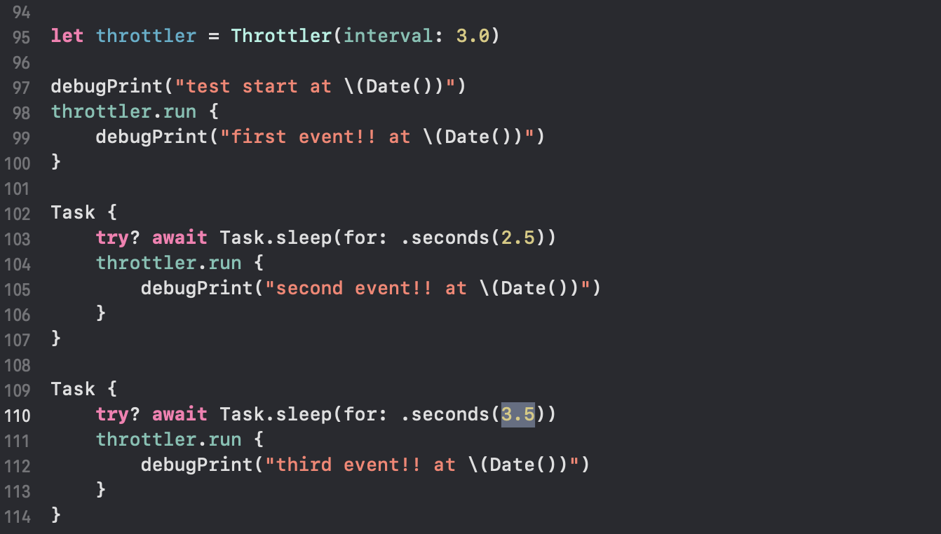 이번에 직접 구현한 클래스는 Throttler라고 이름 붙였어요. Swift의 Timer를 활용해서 간단하고 깔끔하게 만들 수 있답니다! 동작하는 스레드에서 안전하게 전달될 수 있도록 클로져에 @Sendable 도 명시했어요.