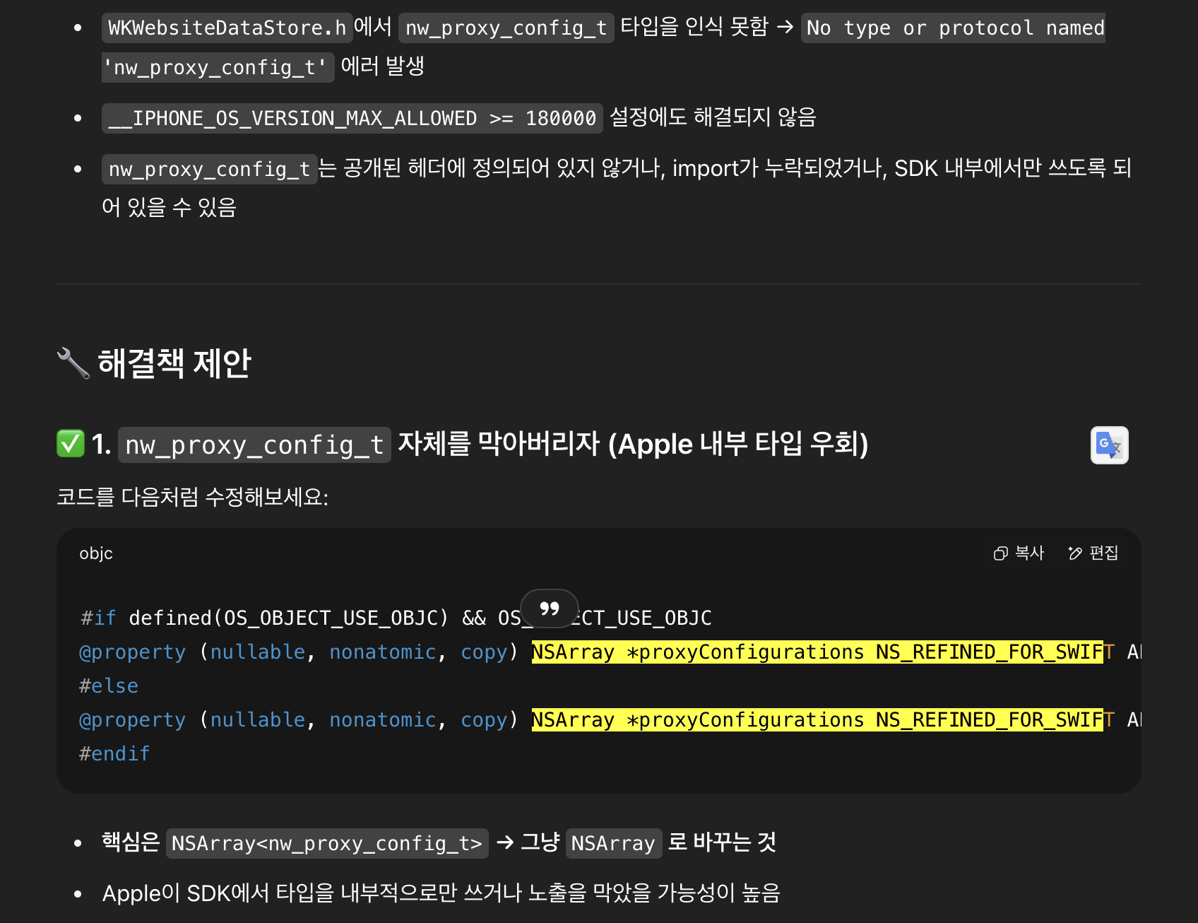 iOS Xcode16 WebKit, nw_proxy_config_t 컴파일 에러 수정방법 feat. chatGPT
