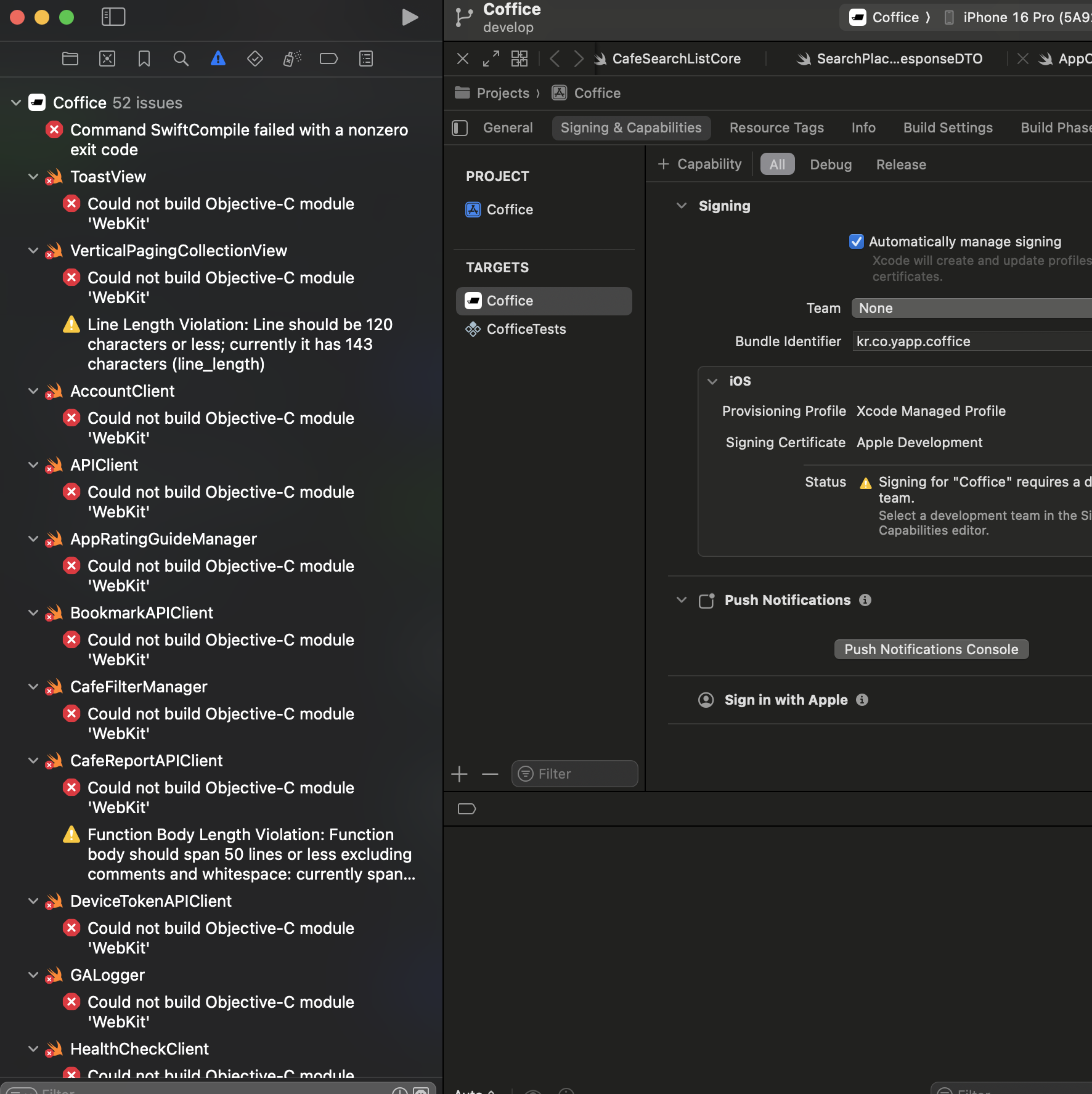 안녕하세요~ iOS앱을 개발하다가 문제가 생겼던 멍구입니다! 🥵오늘은 Xcode 15.2 버전을 통해 앱을 개발하면서 자주 발생했던 'WebKit' module build 이슈 해결방법을 간략하게 소개하려 합니다! 'WebKit'